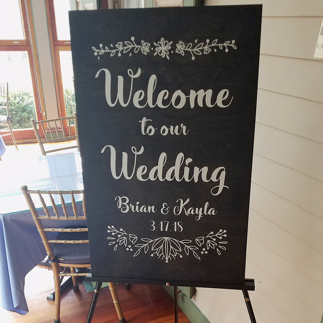 This custom wooden sign is a beautiful piece for the entrance of your wedding ceremony or reception. Measures 19.5 " x 29 " x 1/2"Perfect to prop up on an easle stand or to sit on a table top. Made from 1/2" birch plywood, and stained ebony. The custom message and your names are painted with antique white. Finished with a non-toxic sealer. **Both the text and the design are fully customizable.